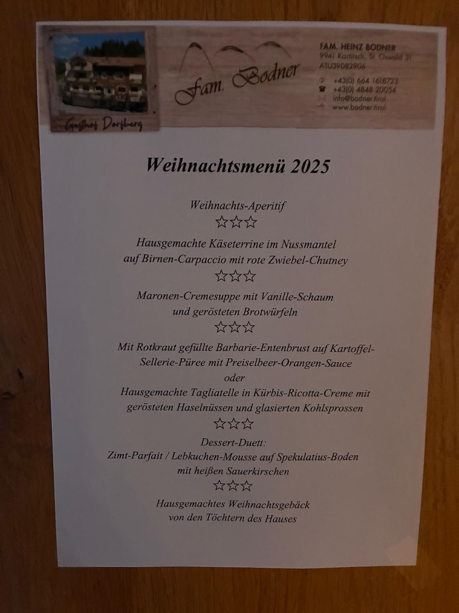 The menu at Gasthaus Dorfberg in Kartitsch offers a delightful array of traditional Austrian dishes, showcasing the rich flavors of the Alps. One of the standout options is the Wiener Schnitzel, a classic dish with a perfectly crispy coating paired with tender veal. For those who enjoy a hearty meal, the Kasspatzln is a must-try - a comforting dish of egg noodles combined with melted cheese and crispy onions, embodying the essence of alpine comfort food.